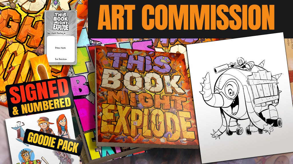 I’ve added a commission tier to This Book Might Explode. I don’t do commissions often, so if you have been wanting one, I am limiting it to 35 for now! It comes with all 3 books signed and numbered by both Eric and I, with a goodie pack! Commissions are 8.5 x 11 on bristol board in either sumi ink or walnut ink.
